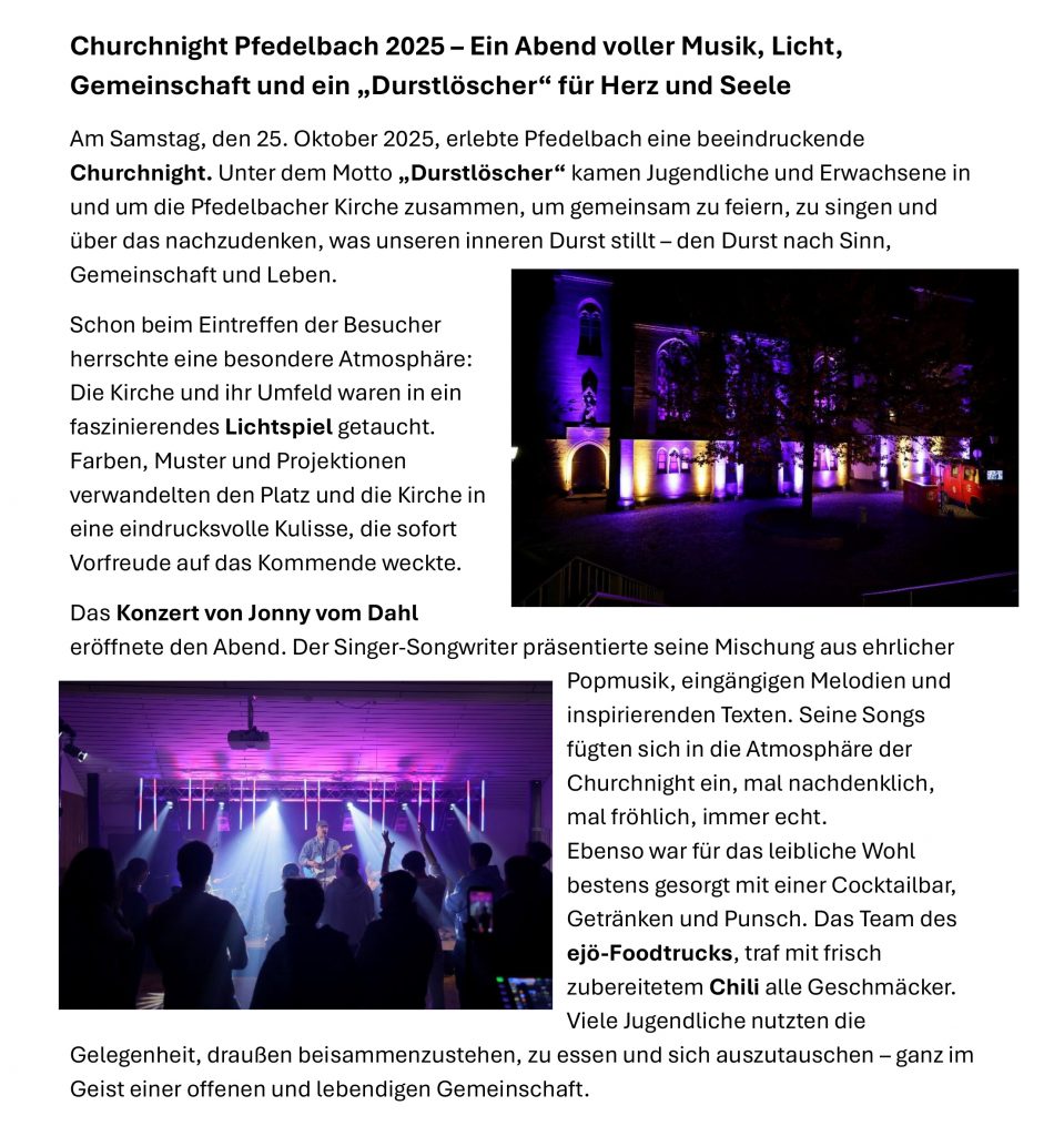 Die Churchnight in Öhringen 2024 war nicht nur ein unvergessliches Event voller Musik, Tanz und guter Laune, sondern auch ein Ort der Begegnung, Gemeinschaft des Glaubens und des Austauschs. Die Mischung aus kulturellen Highlights und spirituellen Momenten schaffte eine einzigartige Atmosphäre, die bei den Jugendlichen noch lange in Erinnerung bleiben wird. Dank der zahlreichen ehrenamtlichen Helfer und der engagierten Künstler wurde die Churchnight zu einem vollen Erfolg, der zeigt, wie wichtig solche Veranstaltungen für die Jugend der Region sind.