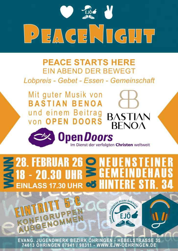 Das Evangelische Jugendwerk Öhringen hatte zur PeaceNight am 15.02.2025 ins evangelische Rosenberggemeindehaus eingeladen. Als Teil der weltweiten Nagelkreuzgemeinschaft ist es den Veranstaltern wichtig für Frieden und Versöhnung in unserer Welt einzutreten und so versammelten sich zahlreiche Teilnehmer unter dem Motto „Peace starts here“ zu einem Abend im Zeichen des Friedens.